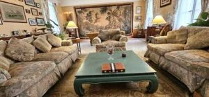 The living room of the chateau stands as elegance and comfort with its 18th century tapestry, serving as the heart of the home. This spacious area, with its high ceiling provides a calm and peaceful atmosphere that invites relaxation, social interaction, to play pool or watch TV while the fireplace also contributes to the warm ambiance, especially during the cooler months. Its design provides a snug spot for family and friends gatherings.